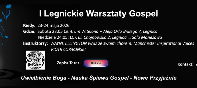 Zapisy … Wypełnij formularz, a następnie kliknij zatwierdź Zapraszamy na warsztaty GOSPEL 2026 w LCK (Legnica Centrum Kultury) w Legnicy dnia 23/24 maja!!!!Nowi prowadzący!Profesjonalni muzycy!Pomimo zmartwień i strachu. Odkryj w sobie muzykę, która wstrząśnie fundamenty.Przenieś koncentracje z codziennych problemów i buduj swojego ducha.Zaufaj Bogu i skieruj myśli na Niego.Nie stresuj…